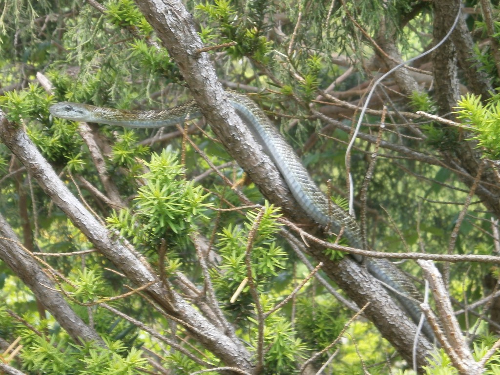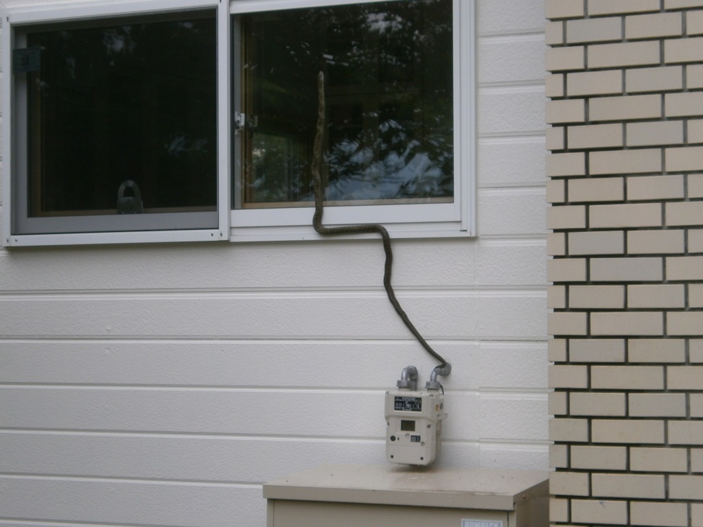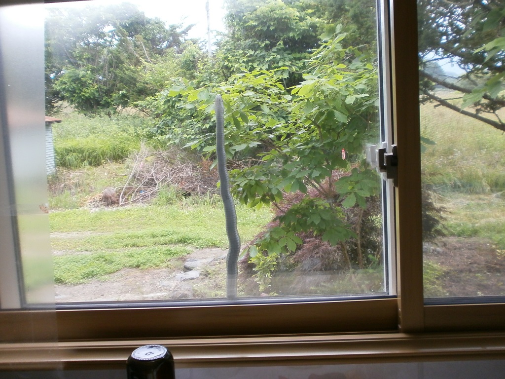 一度は、家内がキッチンで夕食の準備をしているとき、目の前の窓にヘビが現れたことも。プロパンガスのメーターに尻尾を絡めてよじ登ってきているのです。家内はおびえると同時に写真を撮っていました。